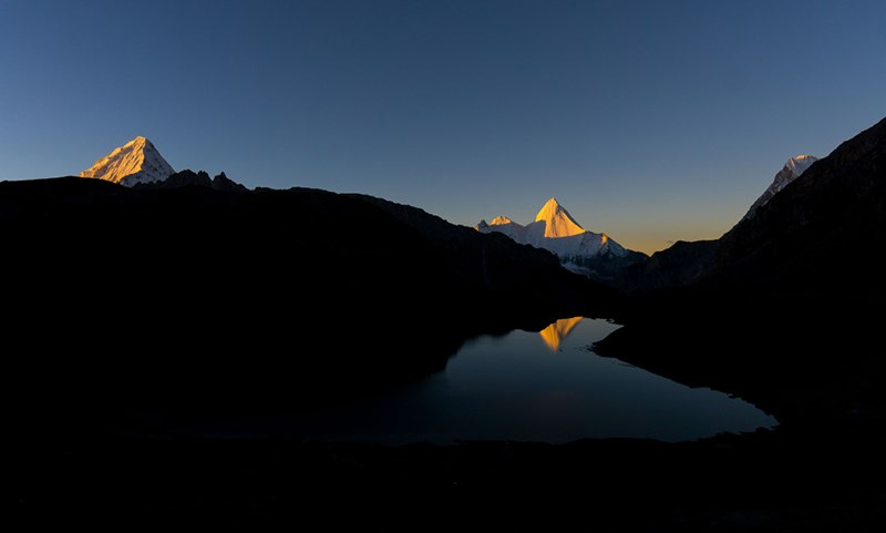 Sonnenaufgang am Siguniang Berg, Shuanqiao Tal, Residenz des tibetischen Stammeshäuptling Wori, tibetisches Dorf Jiaju